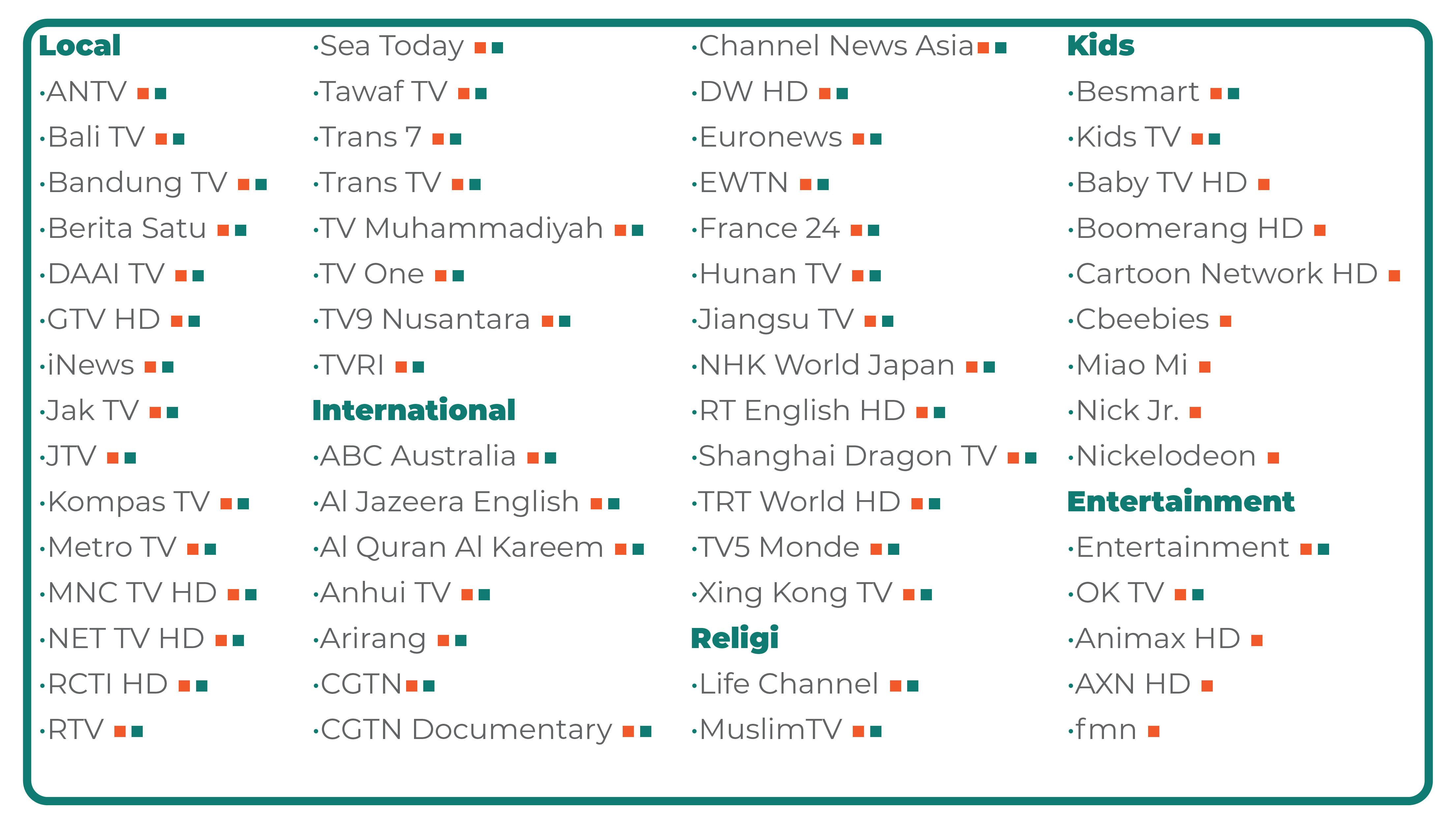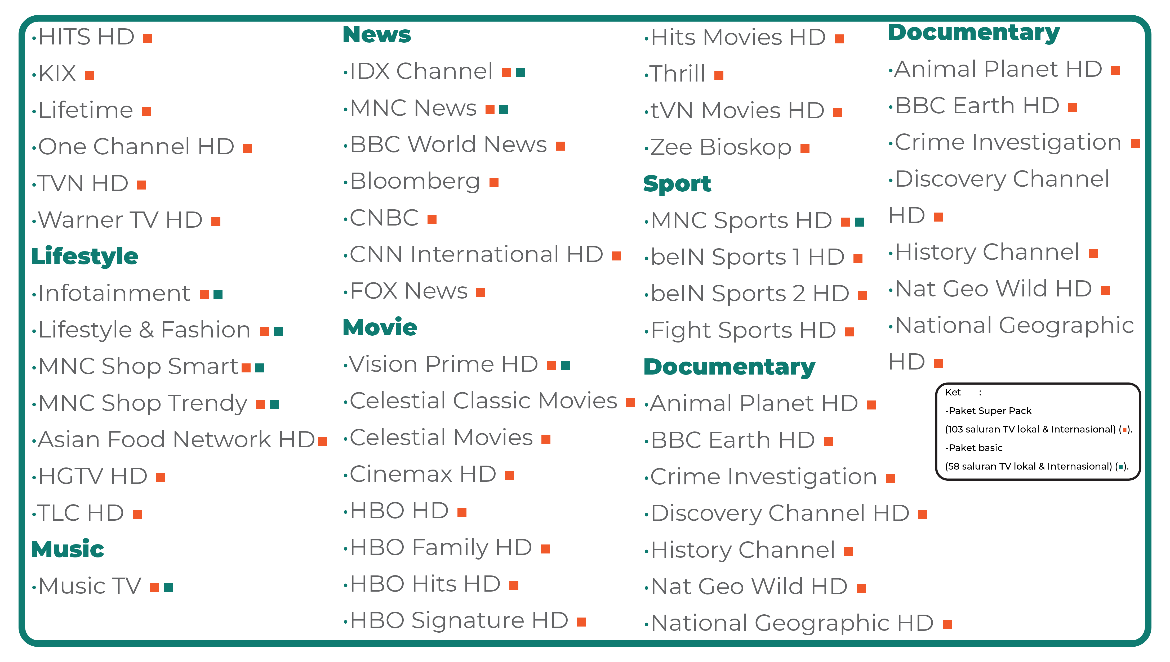 Paket bundling Internet & Saluran TV Premium (lokat & internasional) dengan genre beragam mulai dari Movies, News, Sport, Kids, Entertainment, dsb. Kami memberikan kemudahan bagi Anda dan keluarga dalam menikmati hiburan multimedia tanpa batas, tanpa baper dan galau.